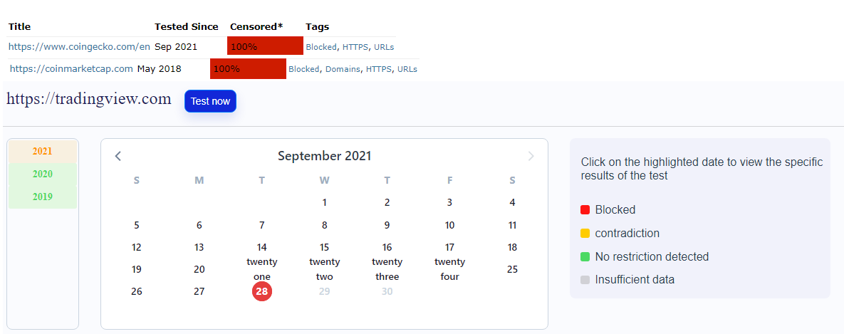 China has blocked access to major cryptocurrency-related websites, including CoinGecko, CoinMarketCap, and TradingView. Several tools that check if China’s internet firewall blocks websites show that these sites are all 100% blocked.