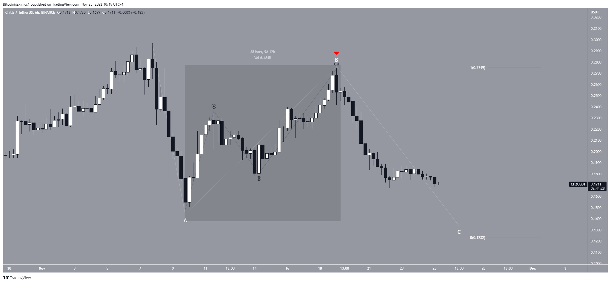 The movement Nov. 9 – 19 (highlighted) resembles an A-B-C corrective structure (black). Therefore, the decrease from Nov. 7 may also be an A-B-C correction (white). In this possibility, the CHZ price is in wave C of this correction.