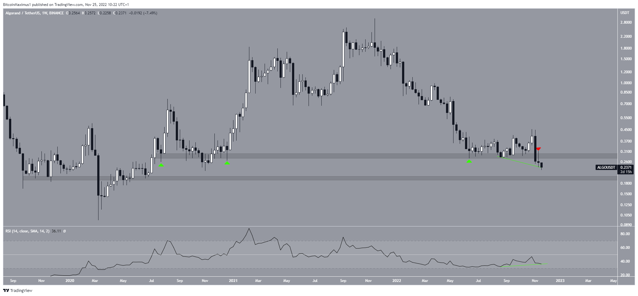 While the weekly RSI has generated bullish divergence (green line), the trend is considered bearish until the ALGO price reclaims the $0.29 resistance area. If it is not successful in doing so, a drop towards $0.20 is the most likely scenario.