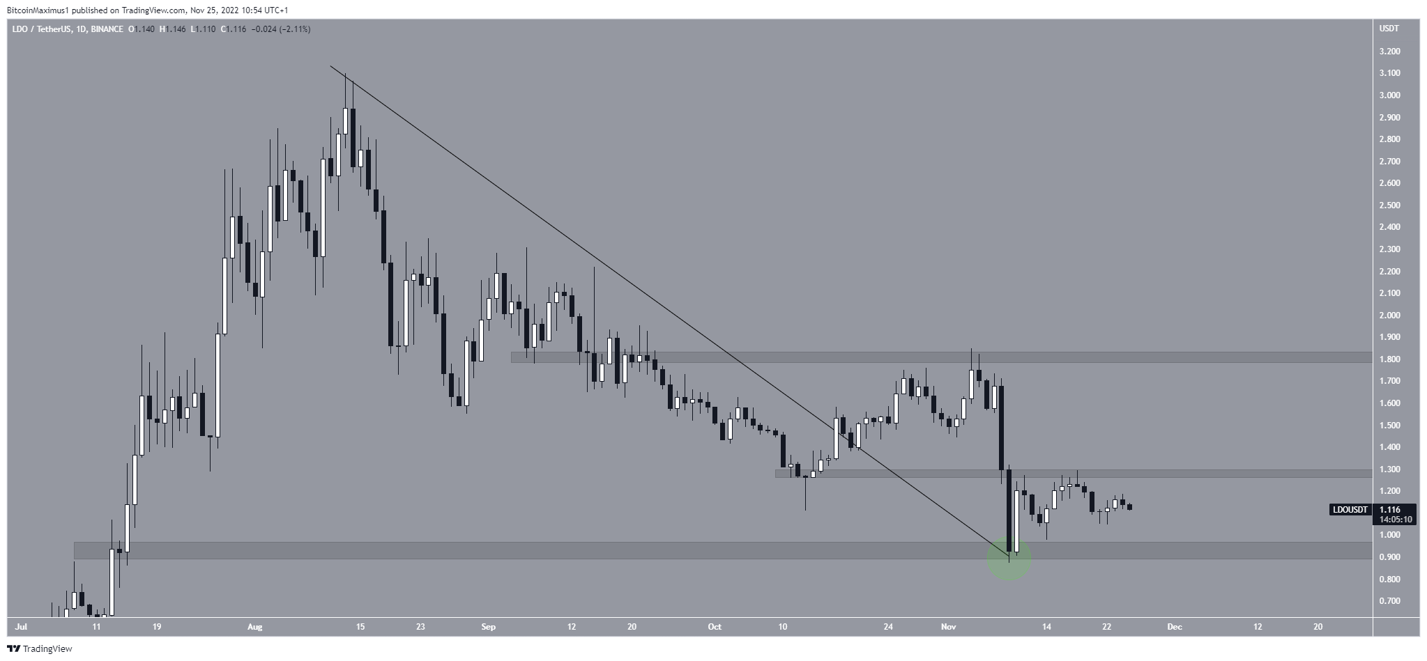 On Oct. 17, the LDO price broke out from a descending resistance line that had been in place since Aug. 14. While it decreased afterward, the downward movement validated the resistance line as support (green circle).