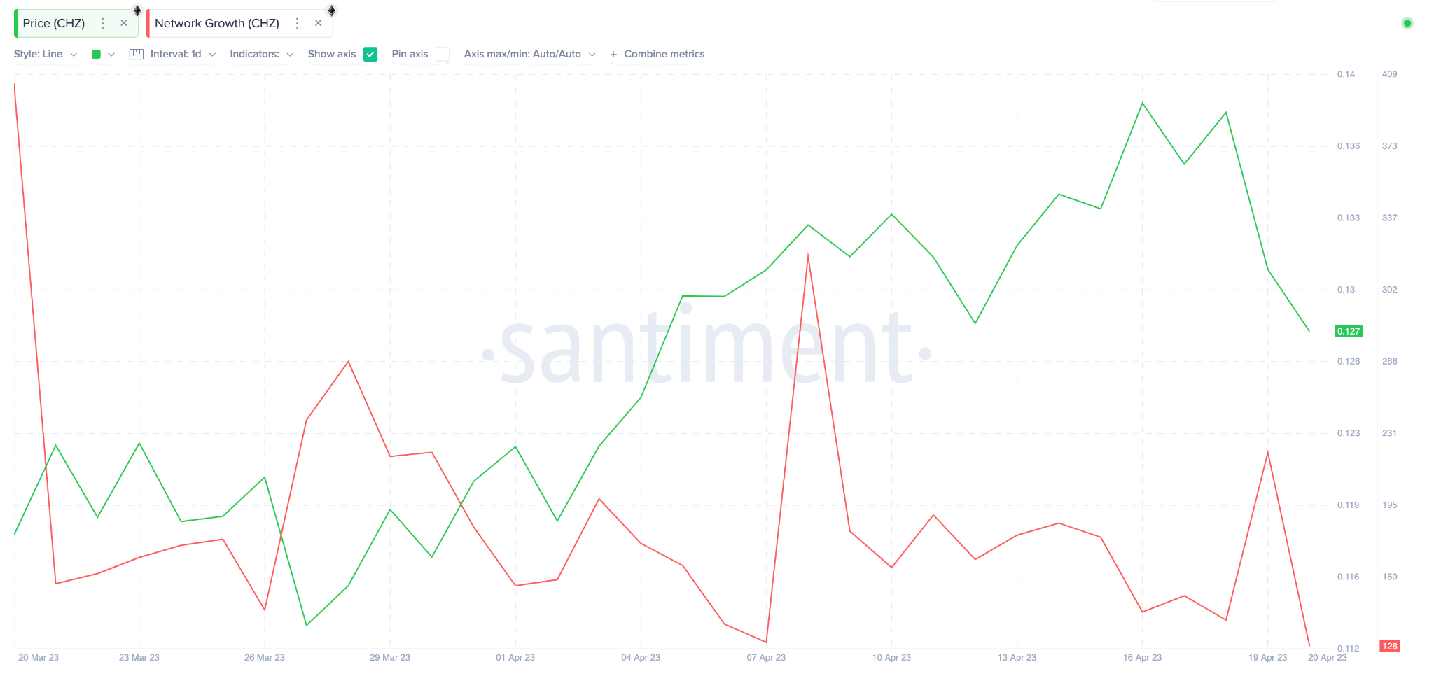 The number of new investors joining the Chiliz ecosystem has dwindled considerably in recent weeks. The Chiliz Network growth, according to data compiled by Santiment, shows a decline of 60% between April 5 and April 20.