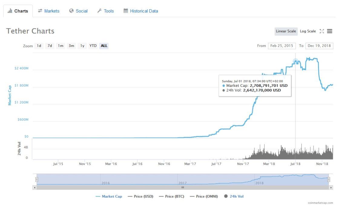 The last two dates presented by Bloomberg tell another interesting story. On July 1, 2018, the statement allegedly showed $1.9 billion in cash. The blockchain data, however, showed over 2.7 billion USDT in circulation — an $800 million difference.