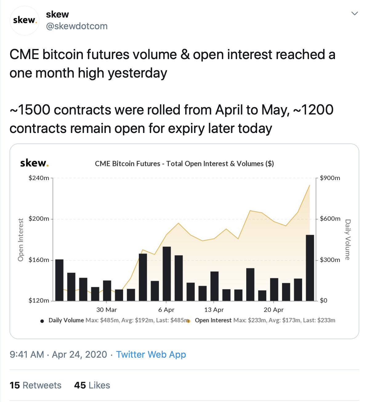 CME Bitcoin futures are booming again after a drastic drop in March, according to skew (@skewdotcom). Yesterday saw a major spike with trading volume and open interest reaching a monthly high.