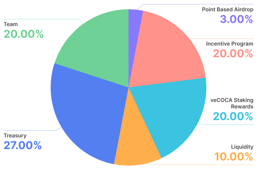 - Token Allocation and Sustainability: The total supply of $COCA is capped at 1 billion tokens. Strategic allocations promote ecosystem growth, community participation, and long-term staking through the veCOCA vote-escrow model, aligning with user interests and enhancing platform scalability.