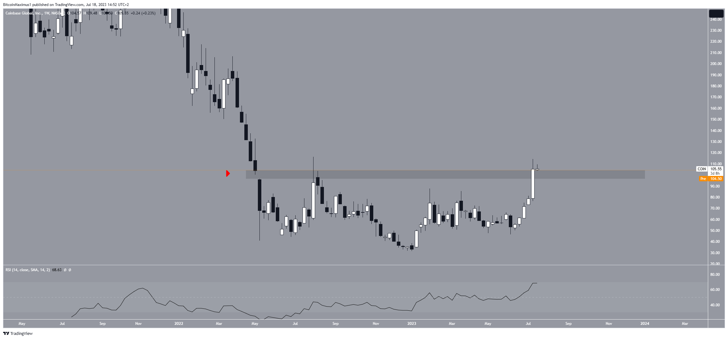 Coinbase (COIN) reached the highest weekly close since April 2022 last week. The close was also made above the $100 horizontal resistance area.