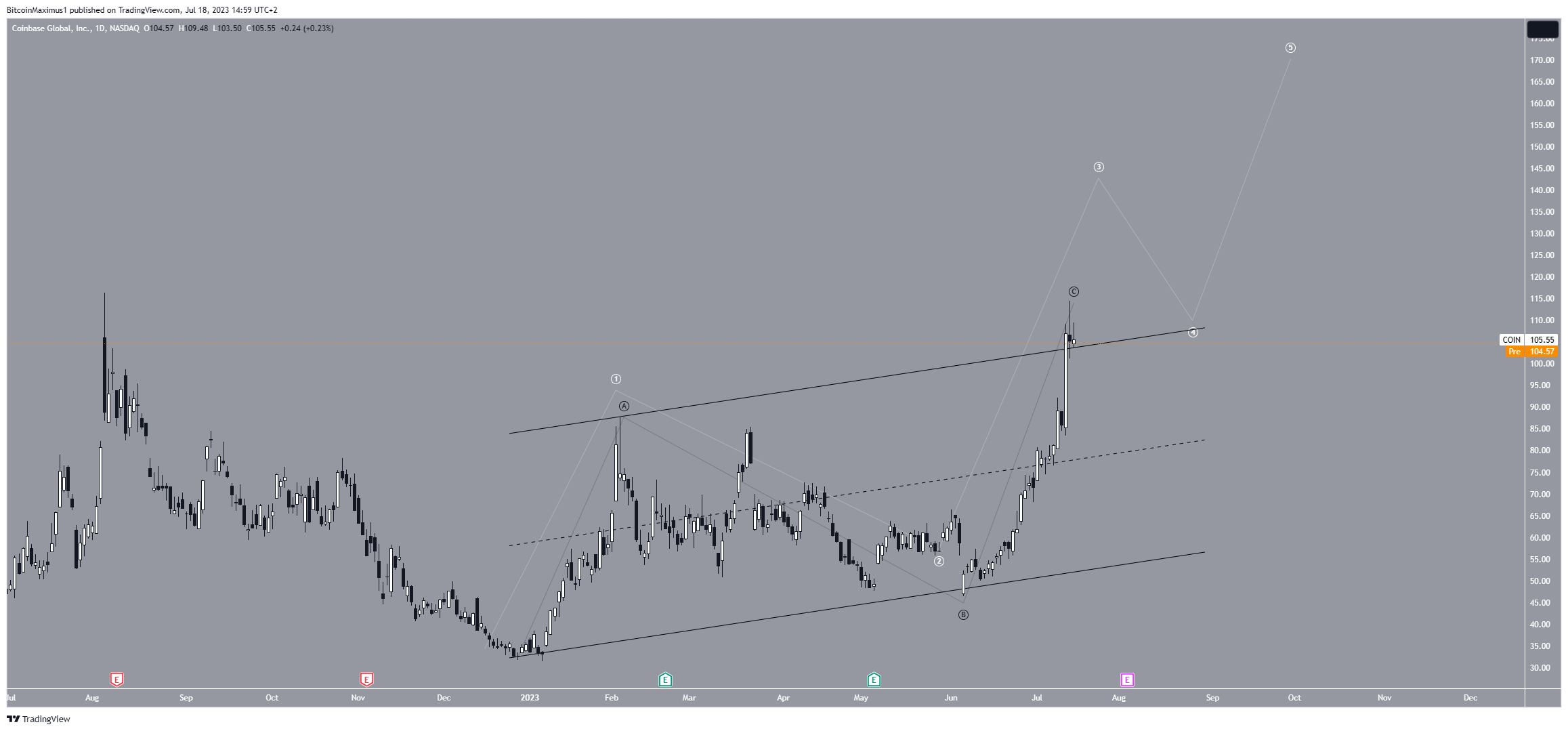 In that case, the COIN price will have likely completed an A-B-C correction (black) and could fall to the channel’s support line at $65.