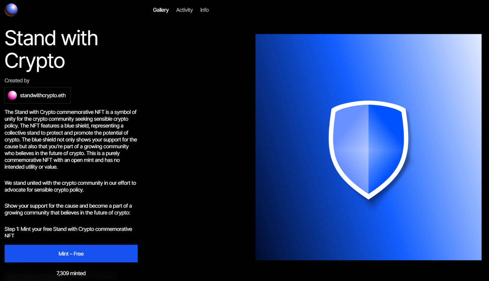 The project enables those in support to mint a blue shield badge for free to use on their Twitter accounts. Furthermore, the NFT is purely commemorative with an open mint and has no intended utility or value.