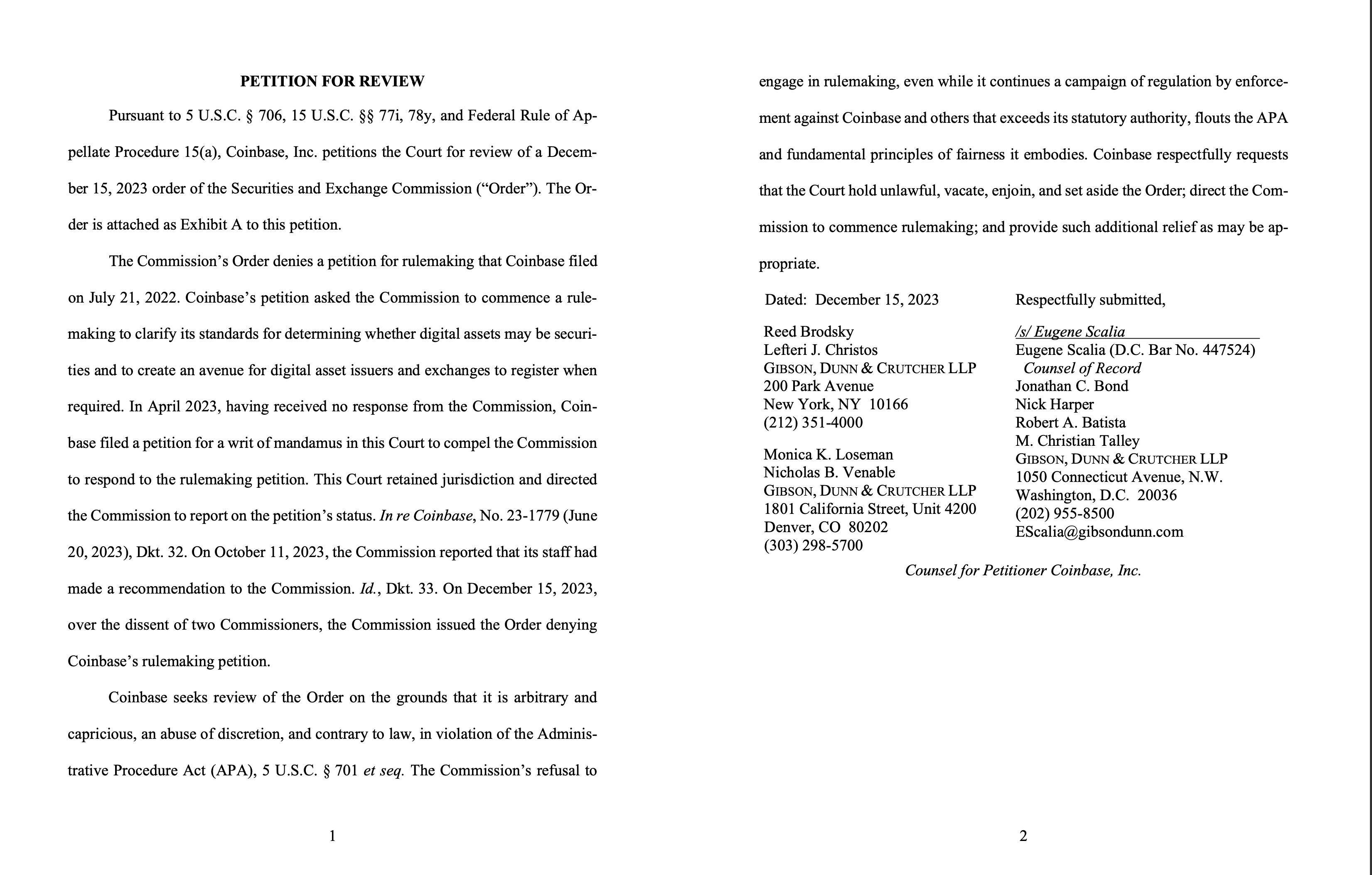 On December 15, the SEC rejected Coinbase’s petition for rulemaking on cryptocurrency. Unfazed, Coinbase swiftly filed an appeal, underscoring its commitment to establishing clear regulatory guidelines.