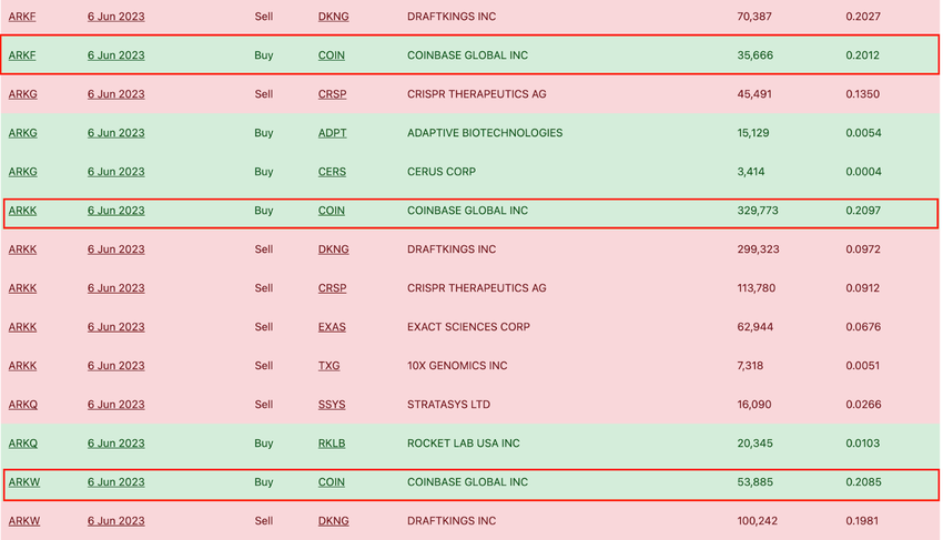 The screenshot below, from Ark Invest Daily Trades, shows that Wood accumulated COIN stock through three different transactions on Tuesday.