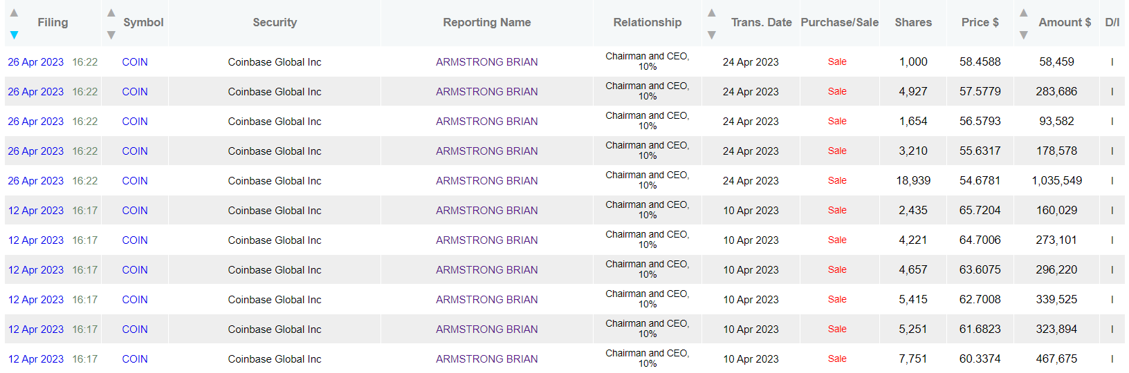 According to dataroma data, Armstrong sold 59,460 shares for $3.46 million in 11 transactions between April 12 and April 26. A breakdown of the sales showed that Armstrong sold 29,730 shares for $1.86 million in six transactions on April 10 before making five further transactions on April 24. Before now, the Coinbase CEO sold 89,196 COIN for $5.8 million in March.
