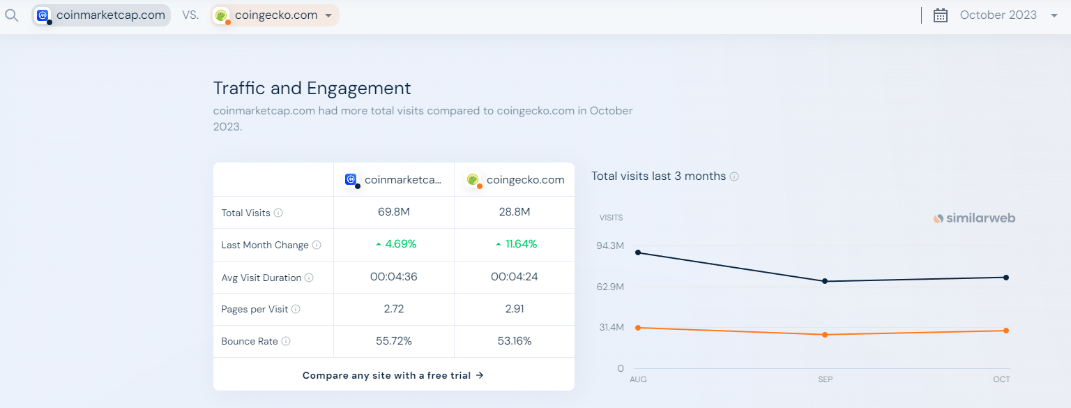 CoinMarketCap’s significant influence is also underscored by its high web traffic, more than double that of its nearest competitor, CoinGecko​​​​.