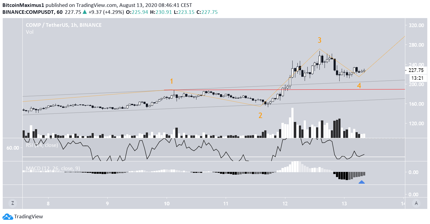 It seems that yesterdayās price movement was the third wave, which came to an end this morning. The fourth wave bottom appears to already have been hit earlier around $218. This could mean that the fifth and final wave has begun, which may be where COMP locks in a new all-time high.