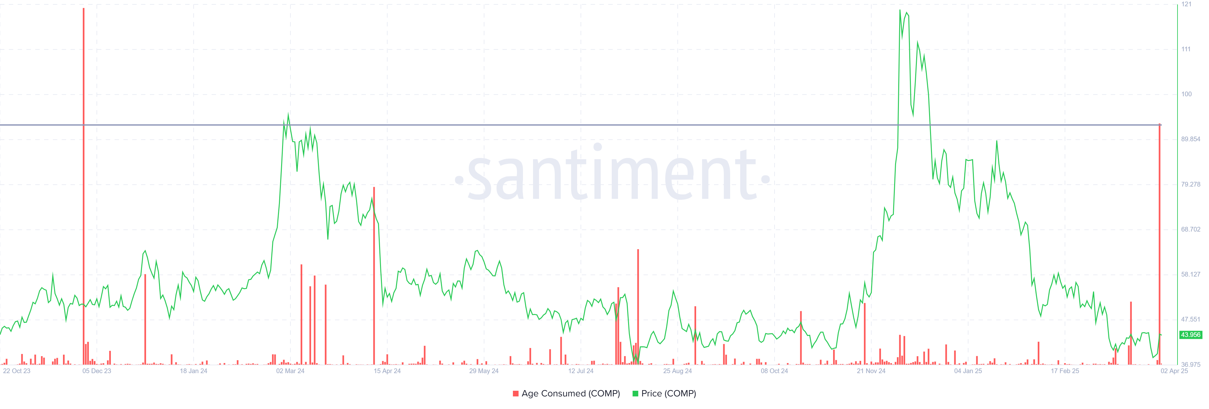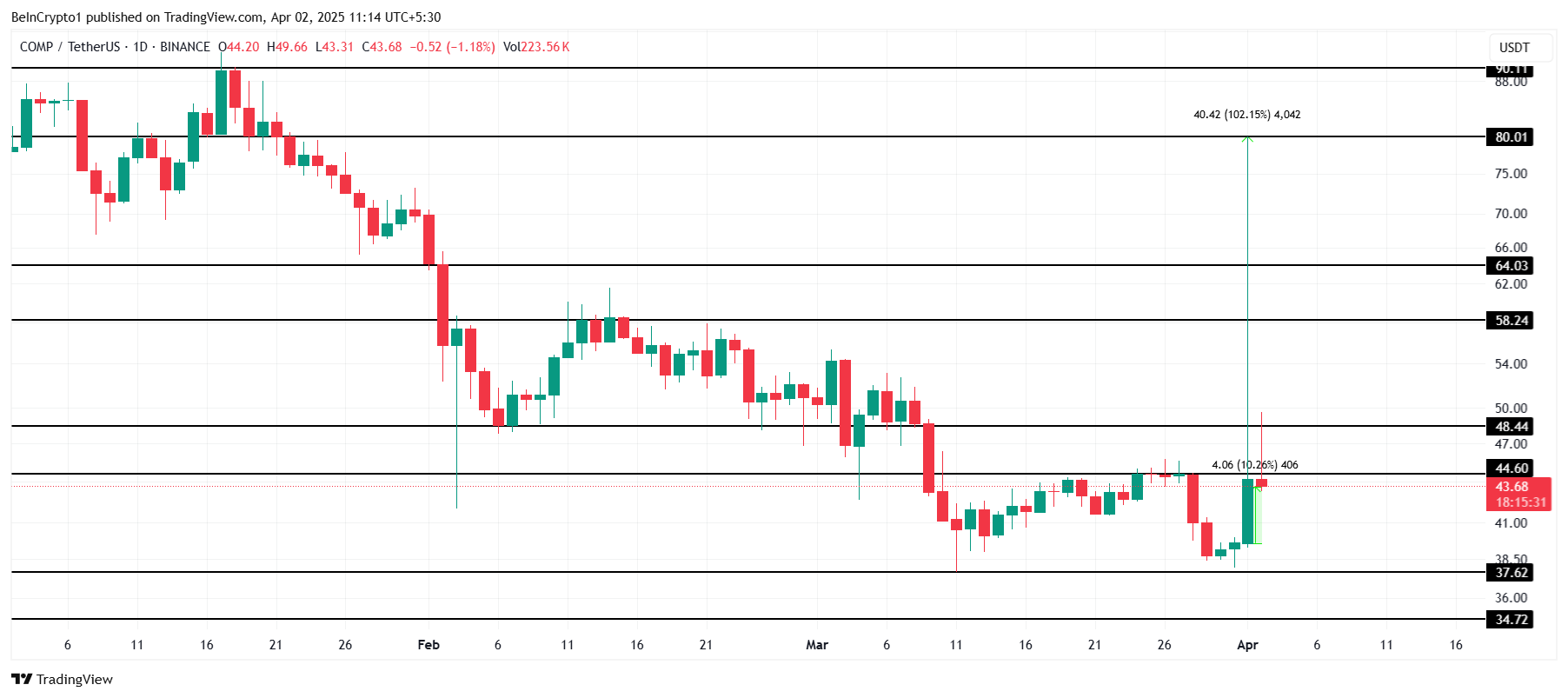 Compound’s price surged by 102% during the intra-day high on Tuesday before dropping back down. Over the last 24 hours, COMP rose by 10%, and the crypto token’s price is currently trading at $43.68. While the rally was notable, the price is still under pressure due to ongoing skepticism.