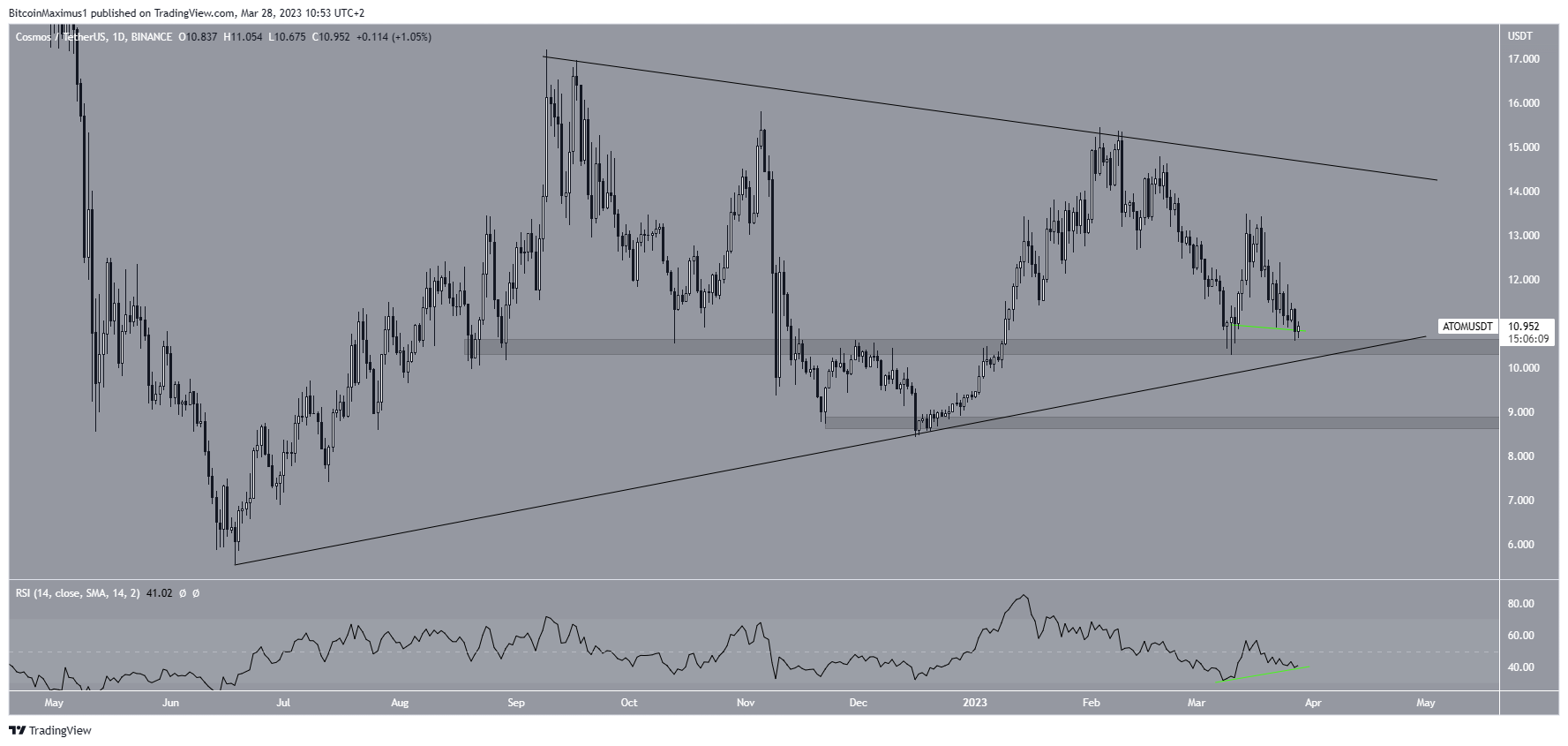 The technical analysis from the daily time frame shows that the Cosmos price is trading at a confluence of support levels at $10.50. The support is created by an ascending support line and the $0.50 horizontal support area.