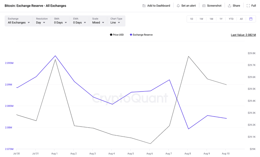 The Cryptoquant data below illustrates how Bitcoin Exchange Reserves have dropped by 14,577 coins within the first 10 days of August.