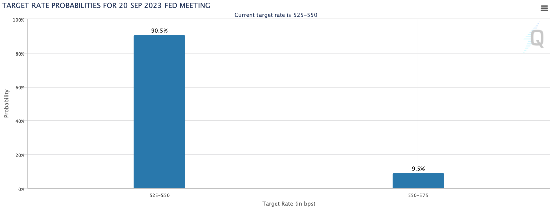 The CME’s FedWatch tool indicates a 91% chance the Fed will pause rates at 5.25%-5.5%. It last halted rate increases in June.