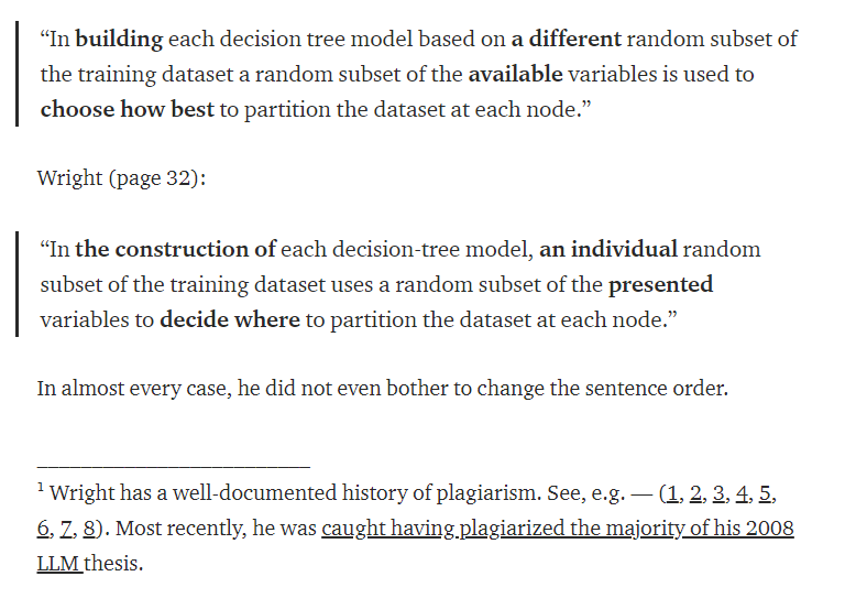 âAs in previous cases of plagiarism, Wright often introduced errors when copying material, especially when it contained math. (âŠ) Sometimes Wright would even forget to define terms he stole from the source material, or introduce an equation without including the intermediate steps needed to make it make sense.â