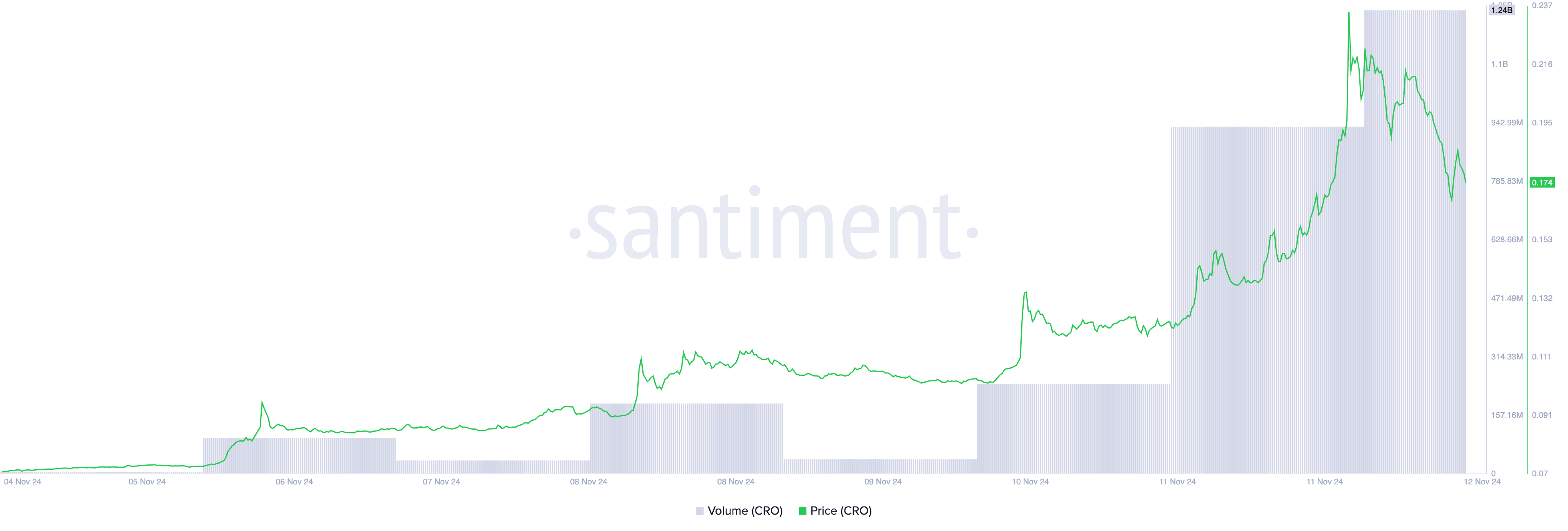 Over the past 24 hours, CRO’s value has surged by 21%. During the same period, its trading volume totaled $1.24 billion, spiking by over 300%.