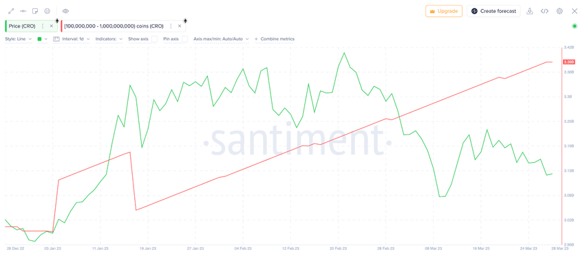 As seen below, the accumulation trend has continued in the last 30 days. Between Feb 17 and March 28, the cluster of whales holding 100 million to 1 billion CRO has increased their balances by 200 million tokens worth nearly $13 million.Â