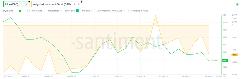 SponsoredSince March 20, when the markets appeared to react to news of a potential Dubai trading license for Crypto.com, Weighted sentiment for Cronos has declined from 0.07 to a negative score of -0.22.