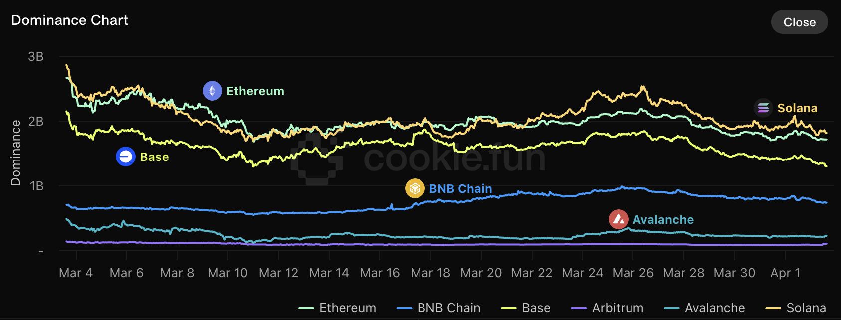Base and BNB remain active players, though their numbers have steadily declined since early March. The trend shows a shift in developer and investor attention toward Ethereum-based projects.