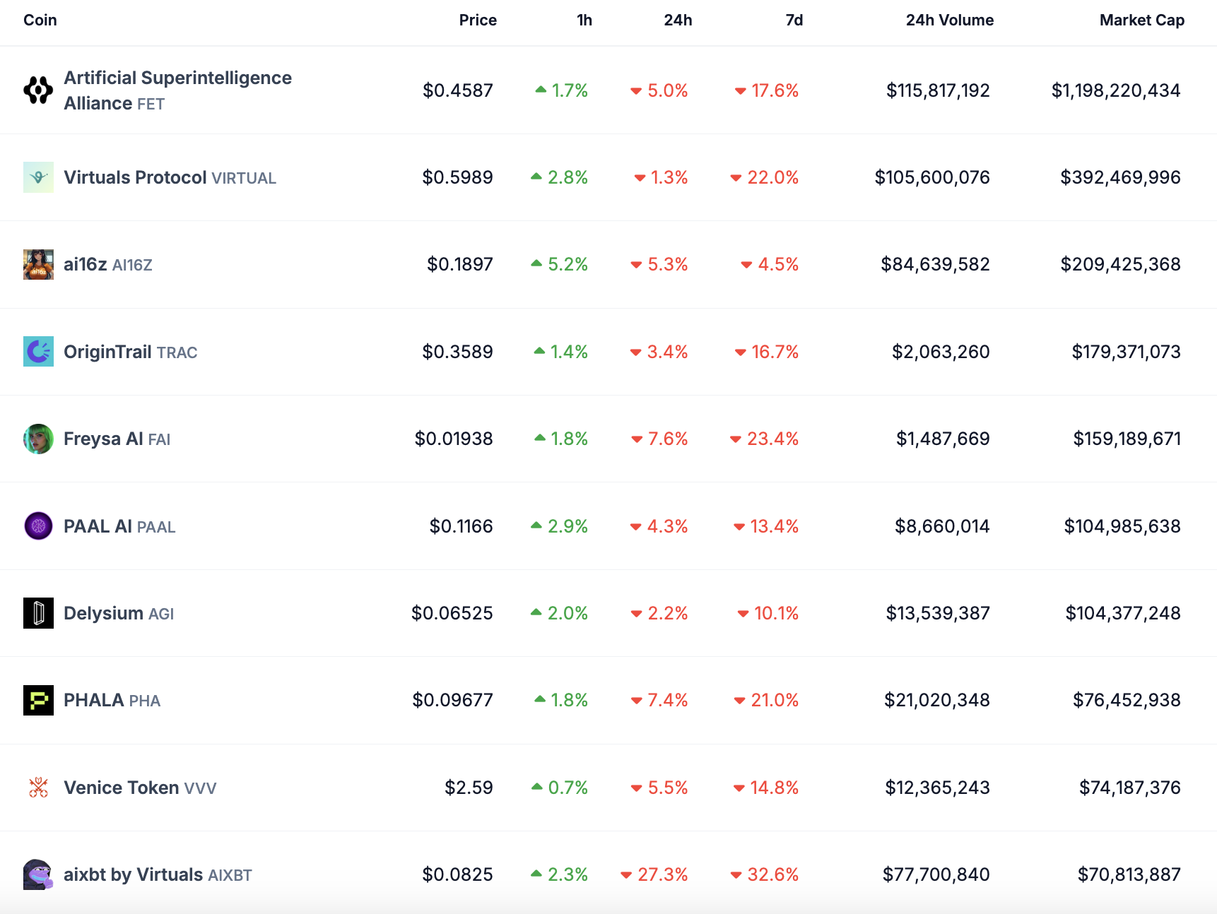 Artificial Superintelligence Alliance (FET) is the only project still above a $1 billion market cap. Its current market cap is $1.1 billion, well below its $5 billion peak from December 2024.