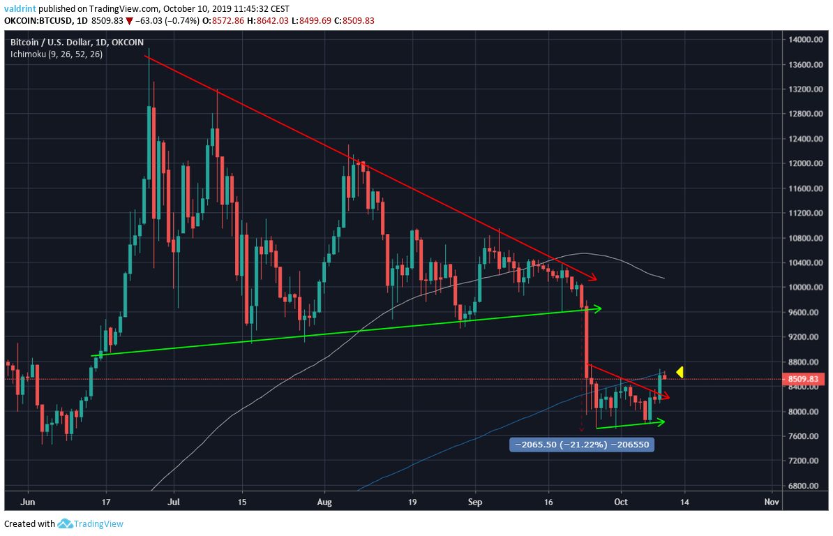 Cryptocurrency trader and enthusiast @SmartContracter identified a fractal that compares the breakdown in October 2018 which led to the low of $3200 to the recent breakdown on September 24, 2019.