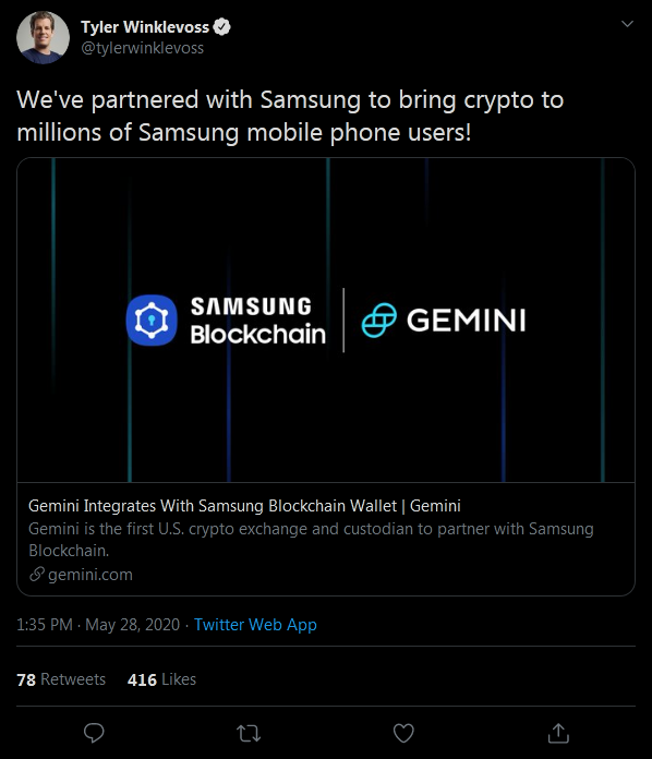 Gemini, the U.S. crypto exchange platform owned by the Winklevoss twins, has announced its integration with Samsung’s blockchain wallet. The Korea-based tech behemoth first introduced a crypto wallet feature in its Galaxy S10 phone brand.