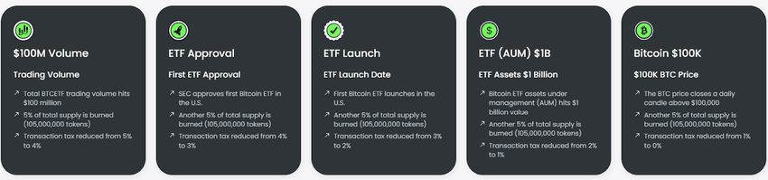 To position itself for the expected large inflows once a Bitcoin ETF launches, BTCETF employs a deflationary token model. A total of 25% of the supply will be permanently removed from circulation through a series of burns tied to ETF approval milestones. For example, 5% of tokens will be burned if the first U.S.