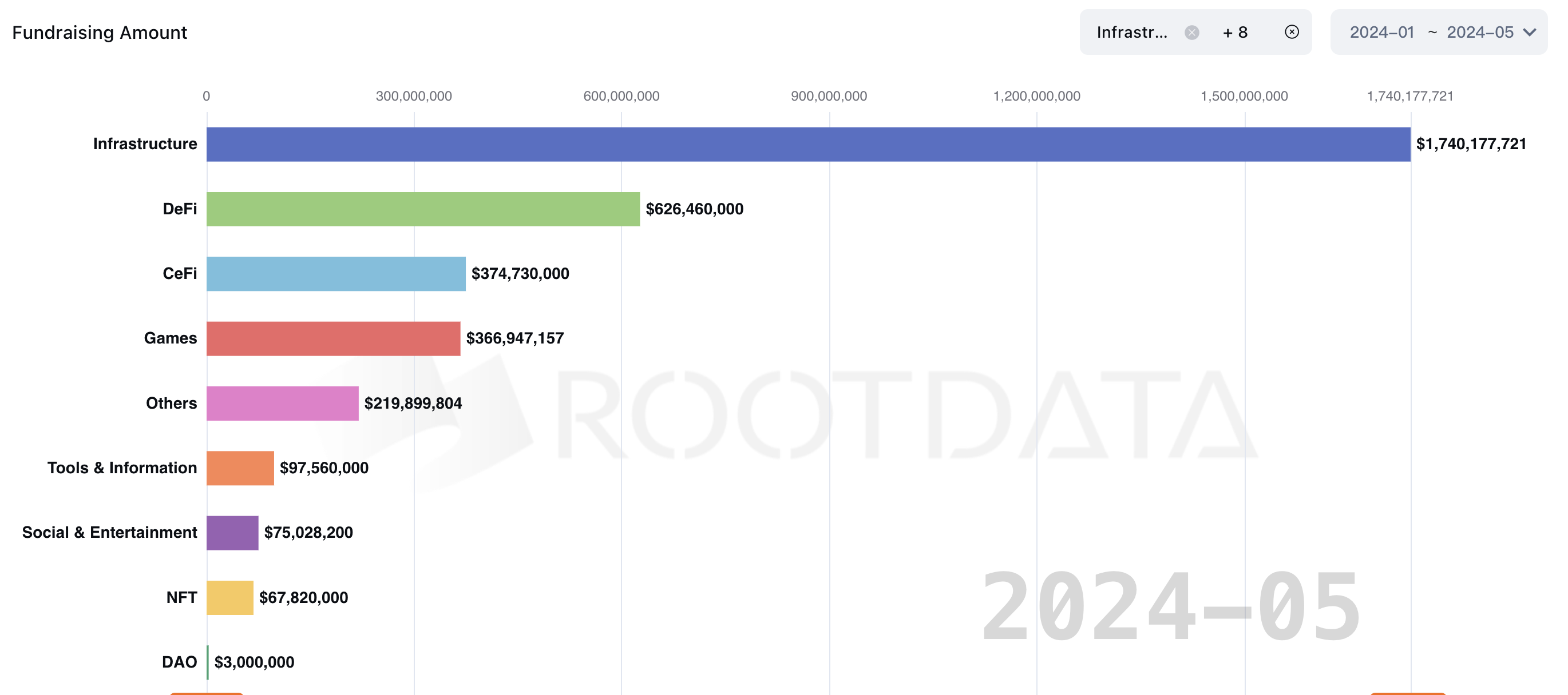 Delving into sector-specific allocations, blockchain infrastructure firms emerge as frontrunners, securing a substantial $1.74 billion in venture capital funding. However, decentralized autonomous organizations (DAOs) present a contrasting narrative, receiving a modest $3 million in funding thus far in 2024.