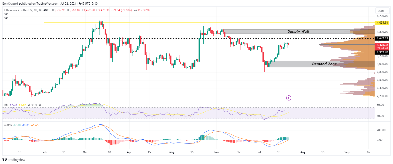 Ethereum’s price has resorted back to its consolidation zone between $3,352 and $3,642 on the daily timeframe. The volume nodes show massive activity between ETH bulls (purple) and bears (orange), with node spikes within this range.