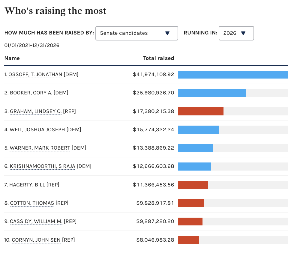 According to the Federal Election Commission (FEC), he has a substantial financial lead over every other Senate candidate this cycle, having raised nearly $42 million.