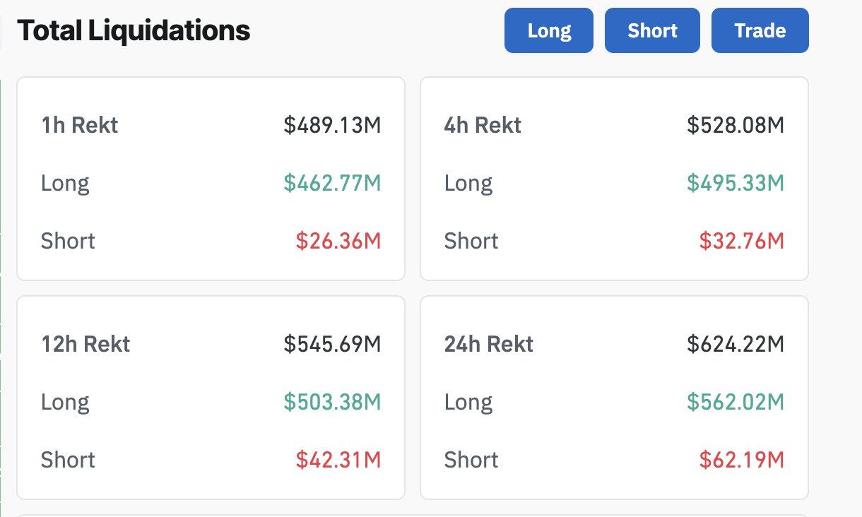 The screenshot below shows that nearly $500 million worth of crypto trades have crumbled to liquidation in the last hour. This includes $462 million in long positions and $26 million in short positions.