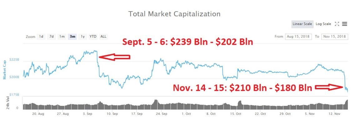 Yesterday’s cryptocurrency market saw a loss of nearly $30 billion, causing Bitcoin (BTC) to sink to a 2018 low point and forcing many altcoins to new all-time lows. Is this what Bitcoin capitulation looks like?