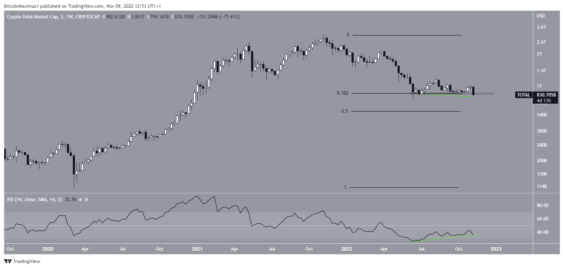 The cryptocurrency market cap is sitting at a very crucial support level at $860 billion. This is both the 0.382 Fib retracement support level and a horizontal support area. The support has been in place since June. So, the next support would be at $585 billion if a breakdown occurs. The 0.5 Fib retracement support level creates it.