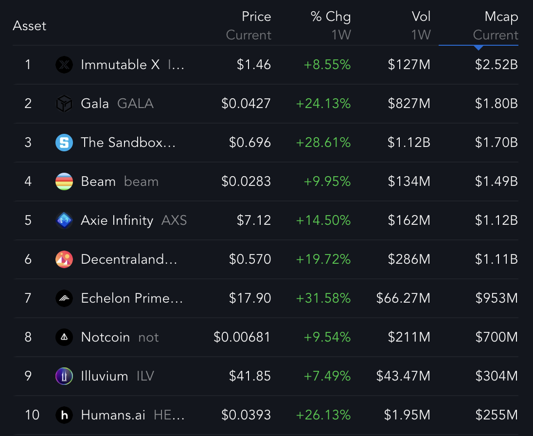 SponsoredCurrently, six metaverse and gaming-focused coins boast market caps above $1 billion, with Immutable X leading the pack. Despite its size, Immutable X sees relatively low weekly trading volume compared to other projects in the space. Meanwhile, established names like GALA, SAND, and MANA have seen significant price gains of over 19% in the past week.