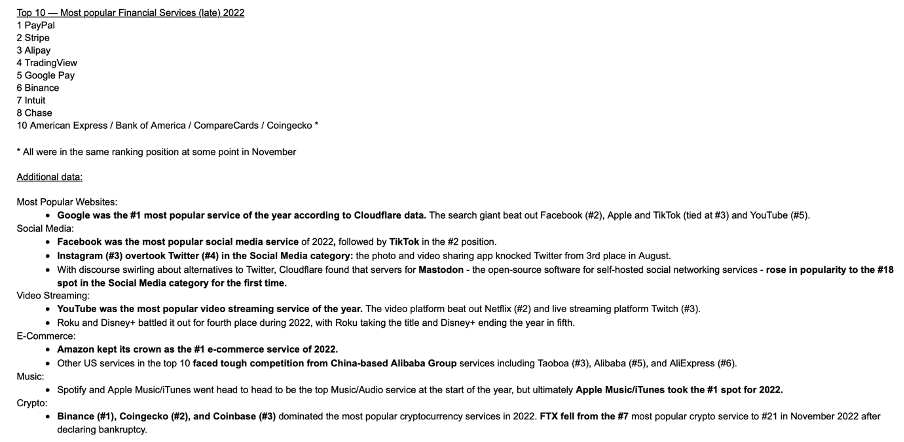 “Binance and CoinGecko were the only crypto services to break into the Financial Services category, alongside industry heavyweights like PayPal, Stripe, Chase, and others.”