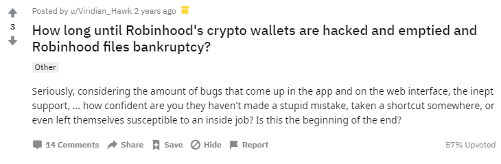 You could go back to 2018 to see evidence that crypto investors saw the writing on the wall at Robinhood. In a Reddit thread entitled, “How long until Robinhood’s crypto wallets are hacked and emptied and Robinhood files bankruptcy,” one user presciently predicted the chain of events unfolding two years later, with the exception of the bankruptcy. The user pointed to the number of bugs that plague the app and the web interface, even calling support “inept,” echoing the battle cry of the investors whose accounts were hacked in recent days.