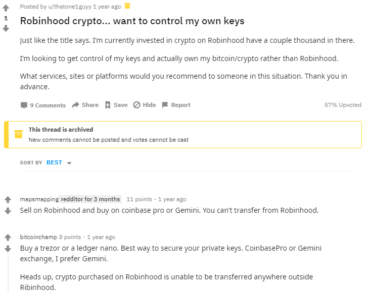 Even as recently as last year, a Reddit member by the name of “thatone1guyy” posted a thread about wanting to control his own keys on Robinhood. At the time, he said he had a “couple thousand in there.” This investor had the foresight to explore how to actually “own” their “bitcoin and crypto rather than Robinhood.”