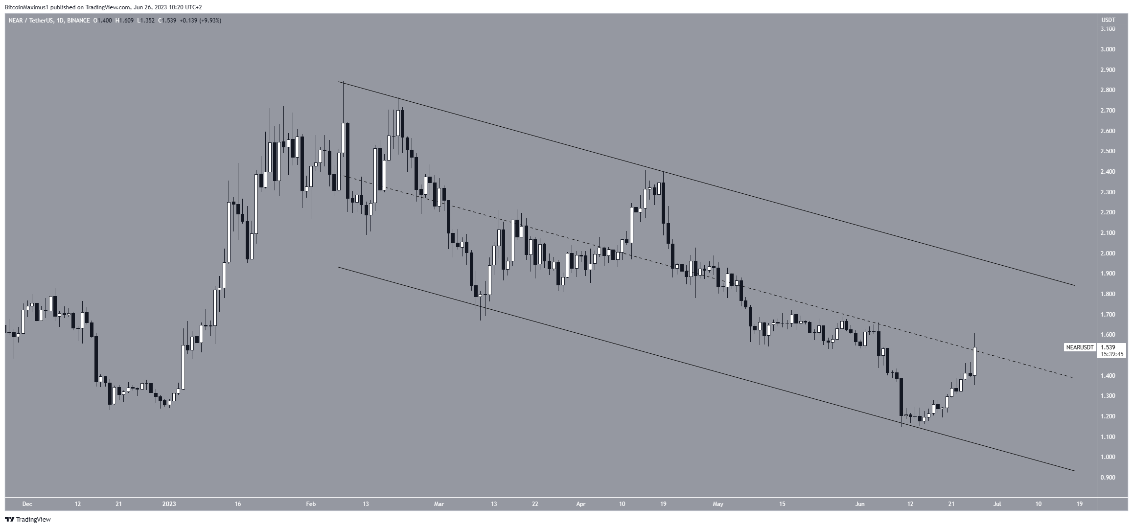 The NEAR price has decreased inside a descending parallel channel since the beginning of February. The descending parallel channel is considered a corrective pattern. Therefore, in a similar fashion to the ascending triangle, a breakout from the channel is expected.Â