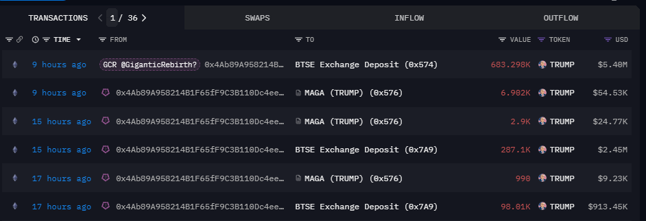 On-chain tracking platform Lookonchain recently reported that a wallet suspected to belong to the renowned crypto trader Gigantic-Cassocked-Rebirth (GCR) deposited 1.08 million MAGA (TRUMP) meme coins into the BTSE Exchange. On-chain data reveals that the transfers started around seventeen hours ago. These tokens are valued at approximately $8.85 million.