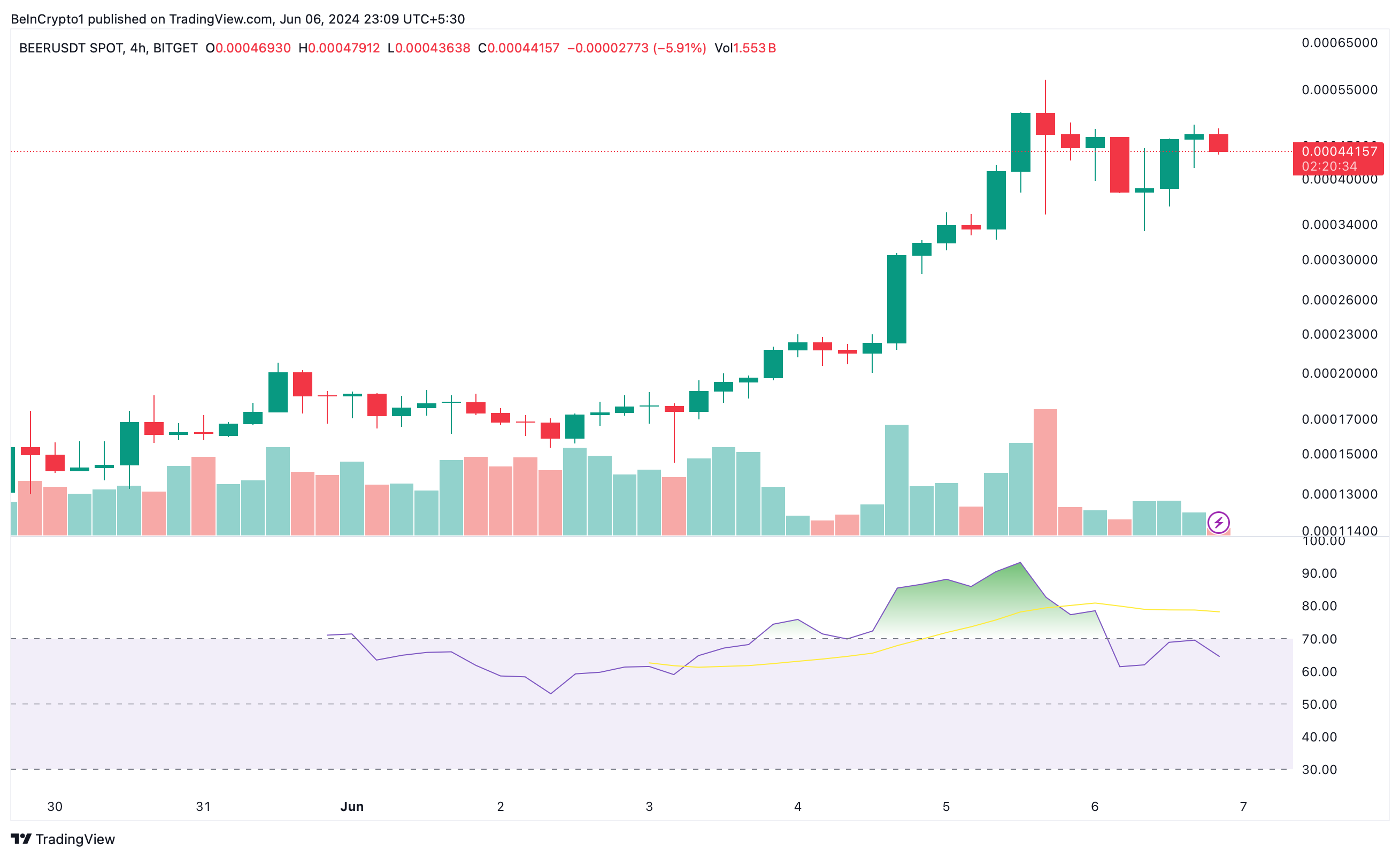 Analyzing BEER’s 4-hour chart reveals a parabolic growth pattern, with low support at $0.00033 and resistance at $0.00047. The all-time high (ATH) stands at $0.00057. The Volume Oscillator’s alignment with the price suggests movement driven by both buyer and seller sentiment, while the Relative Strength Index (RSI) is at 64.4, indicating potential overbought conditions.