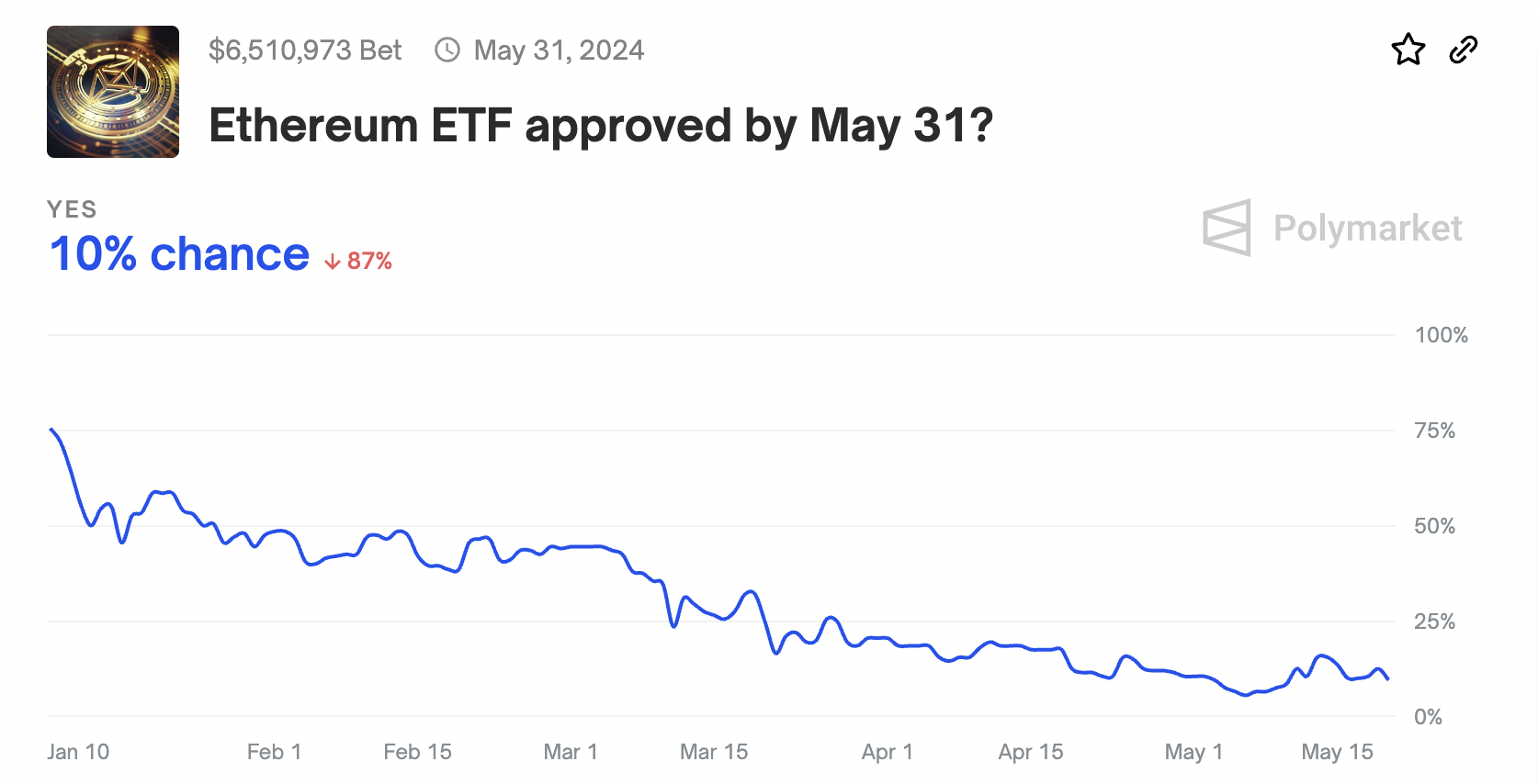 Moreover, Bloomberg’s senior ETF analyst Eric Balchunas estimates less than a 35% chance of SEC approval for Ethereum ETFs. Similarly, bets on Polymarket place the likelihood at just 10%.