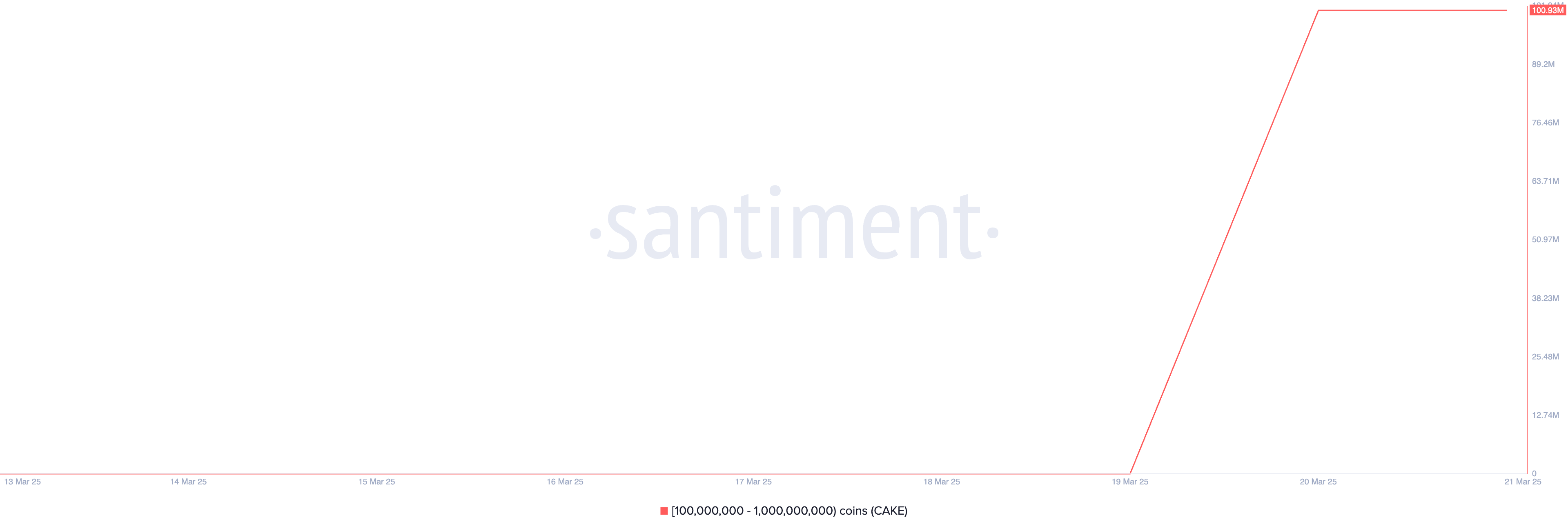 According to Santiment, previously inactive CAKE whales—holding between 100 million and 1 billion tokens—have become active once again. Over the past 24 hours, these large investors have accumulated 101 million CAKE, valued at over $250 million at current market prices.