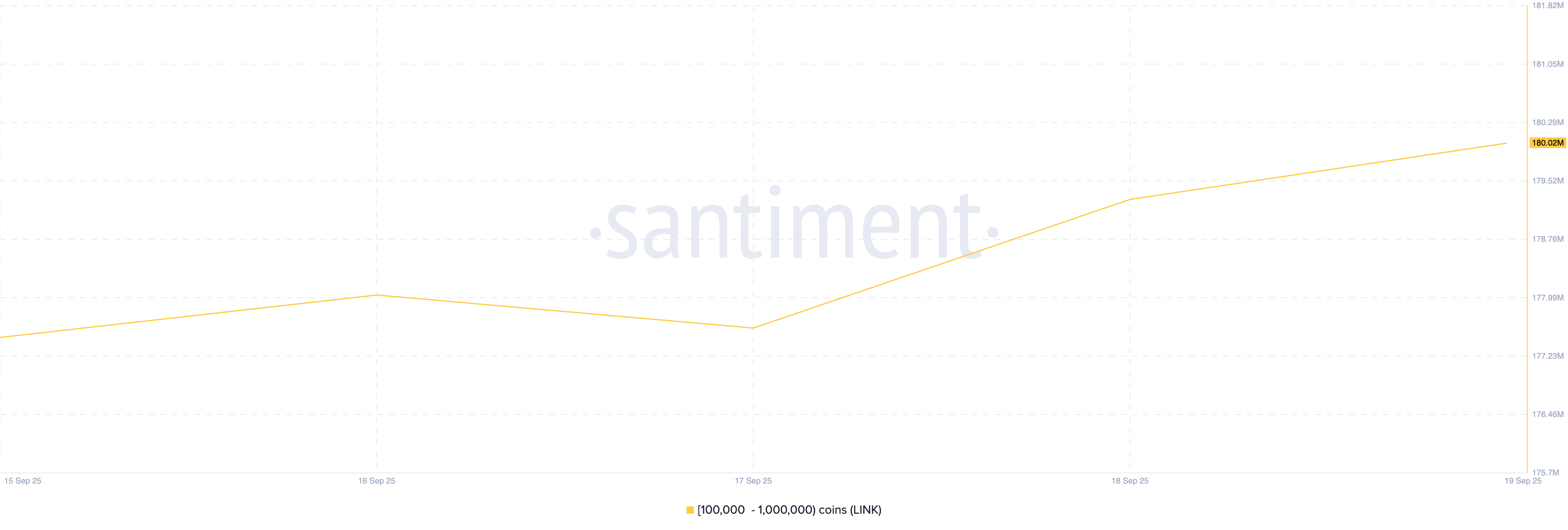 According to on-chain data from Santiment, during the period in review, whale addresses holding between 100,000 and 1 million LINK have acquired 2.5 million tokens valued at above $61 million at current market prices.