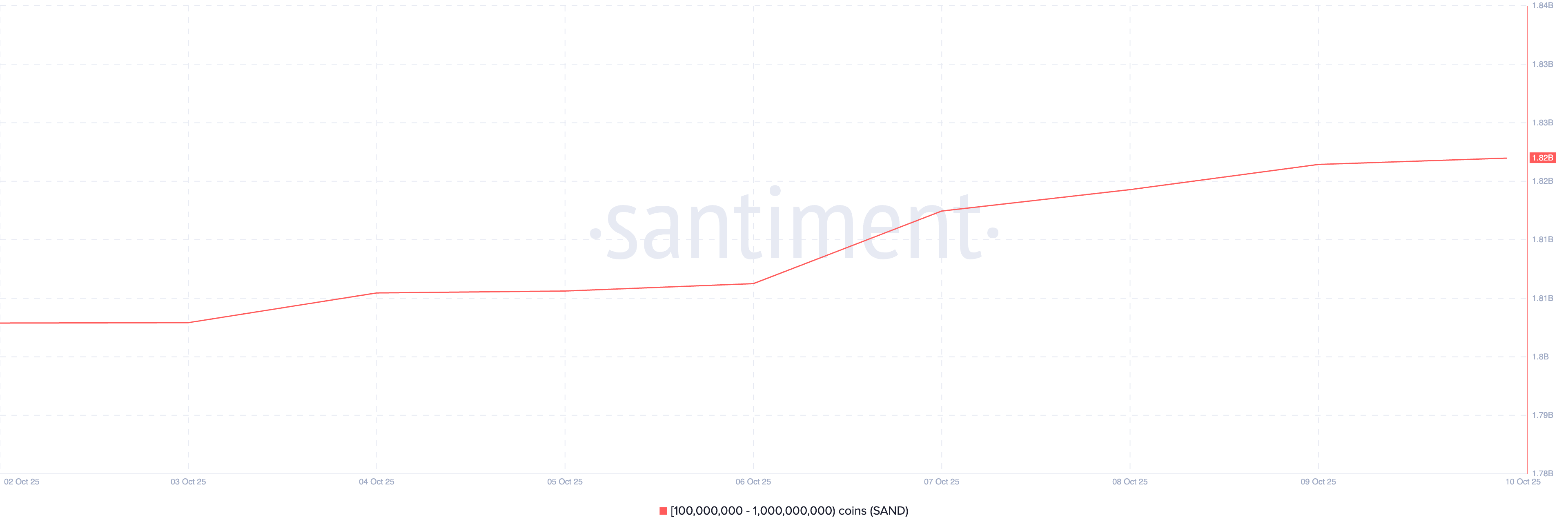Santiment data shows that addresses holding between 100 million and 1 billion SAND have increased their balances by 20 million tokens in the past week.