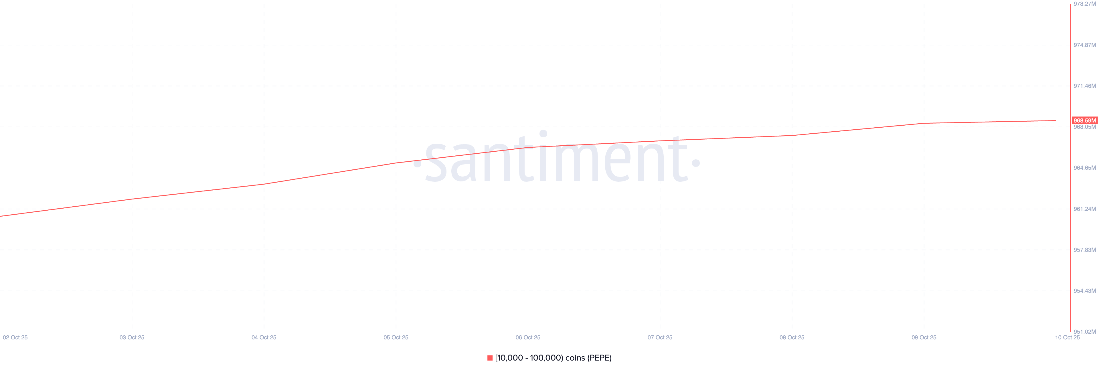 Solana-based meme coin PEPE has also caught the attention of large investors this week. According to on-chain data from Santiment, addresses holding between 10,000 and 100,000 PEPE tokens have collectively added 8 million tokens to their wallets over the week under review.