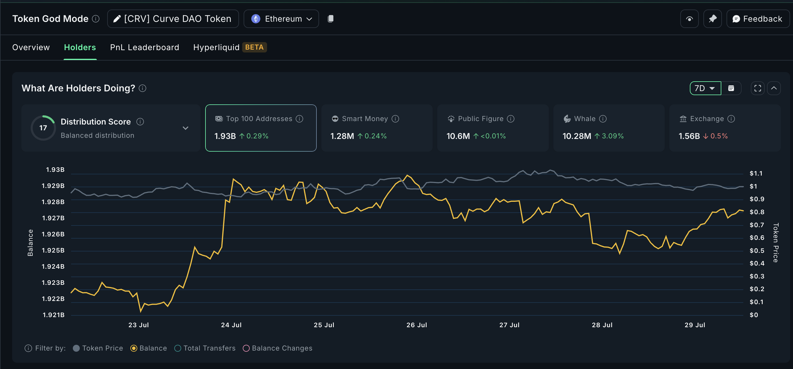 Unlike ONDO, CRV isn’t flying under the radar; it’s moving. And crypto whales are staying on board. The exchange balance dropped by -0.5%, and the distribution score shows a healthy spread, pointing to ongoing demand from long-term holders, not just speculative traders.