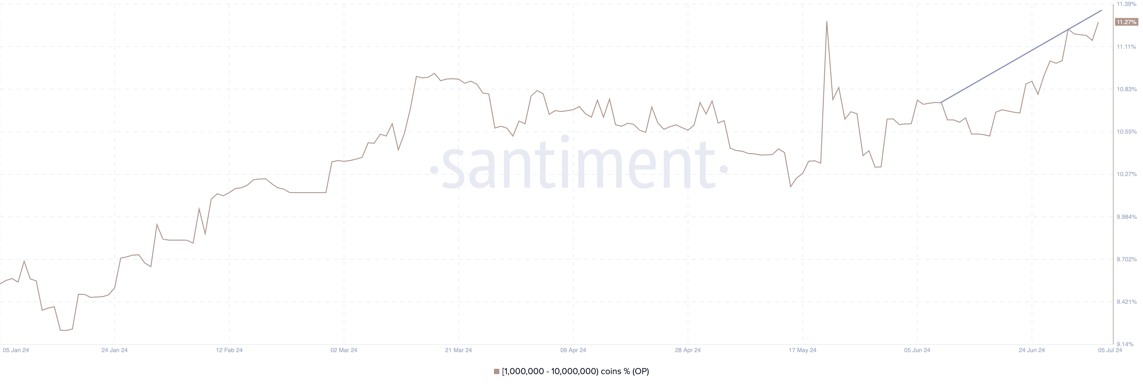 According to Santiment, whales hodling between 1 million to 10 million OP added to their balance in the first week of this month. As a result, this cohort now holds 11.27% of the total OP supply.