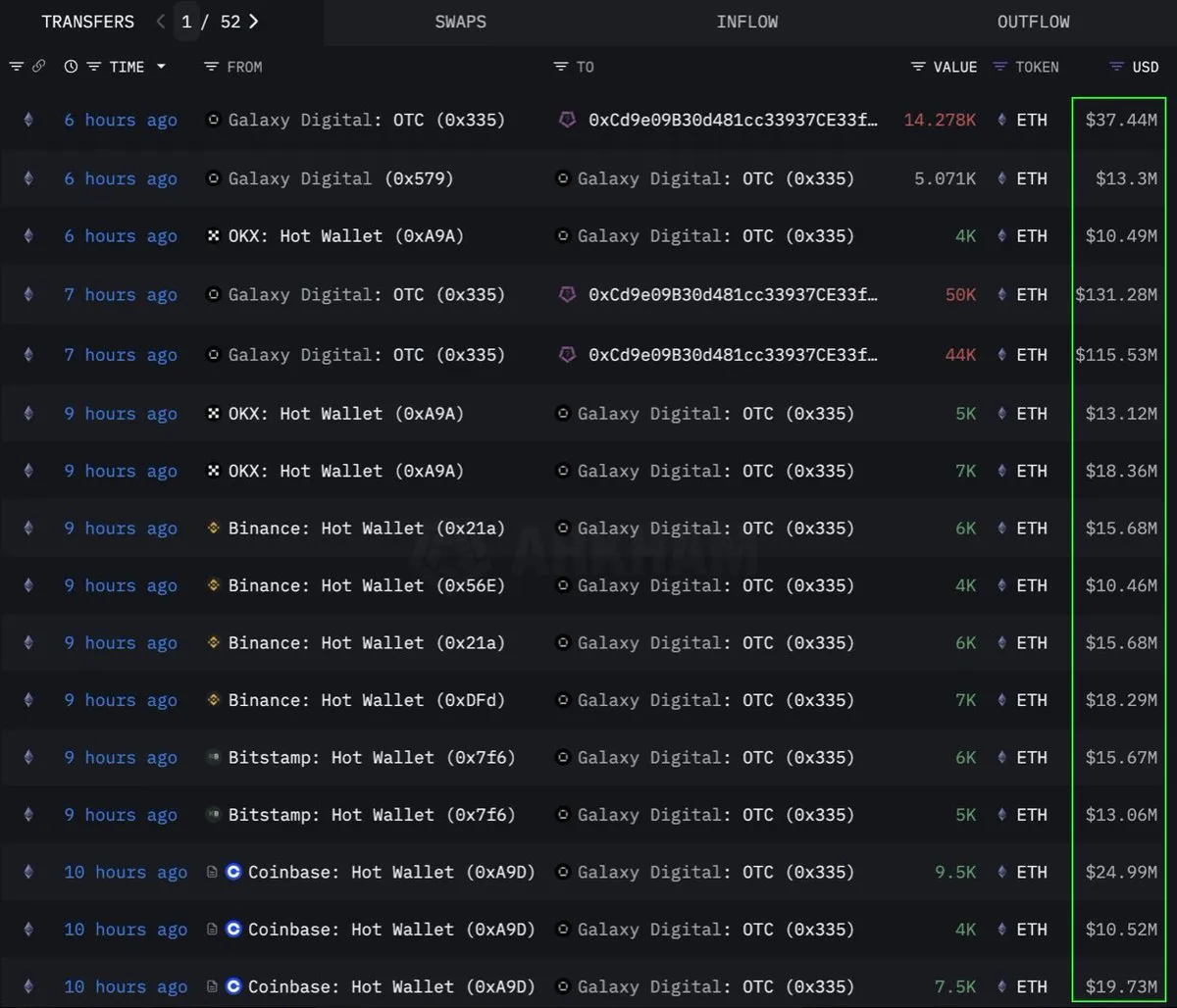According to data from Lookonchain, an institution or whale conducted a large-volume purchase of 108,278 Ethereum (ETH), equivalent to $283 million, through an OTC (over-the-counter) channel. The Galaxy Digital OTC wallet executed this transaction. This one withdrew 89,000 ETH (worth $233.5 million) from exchanges in the previous 12 hours before transferring 108,278 ETH to a wallet with the address 0x0b26.
